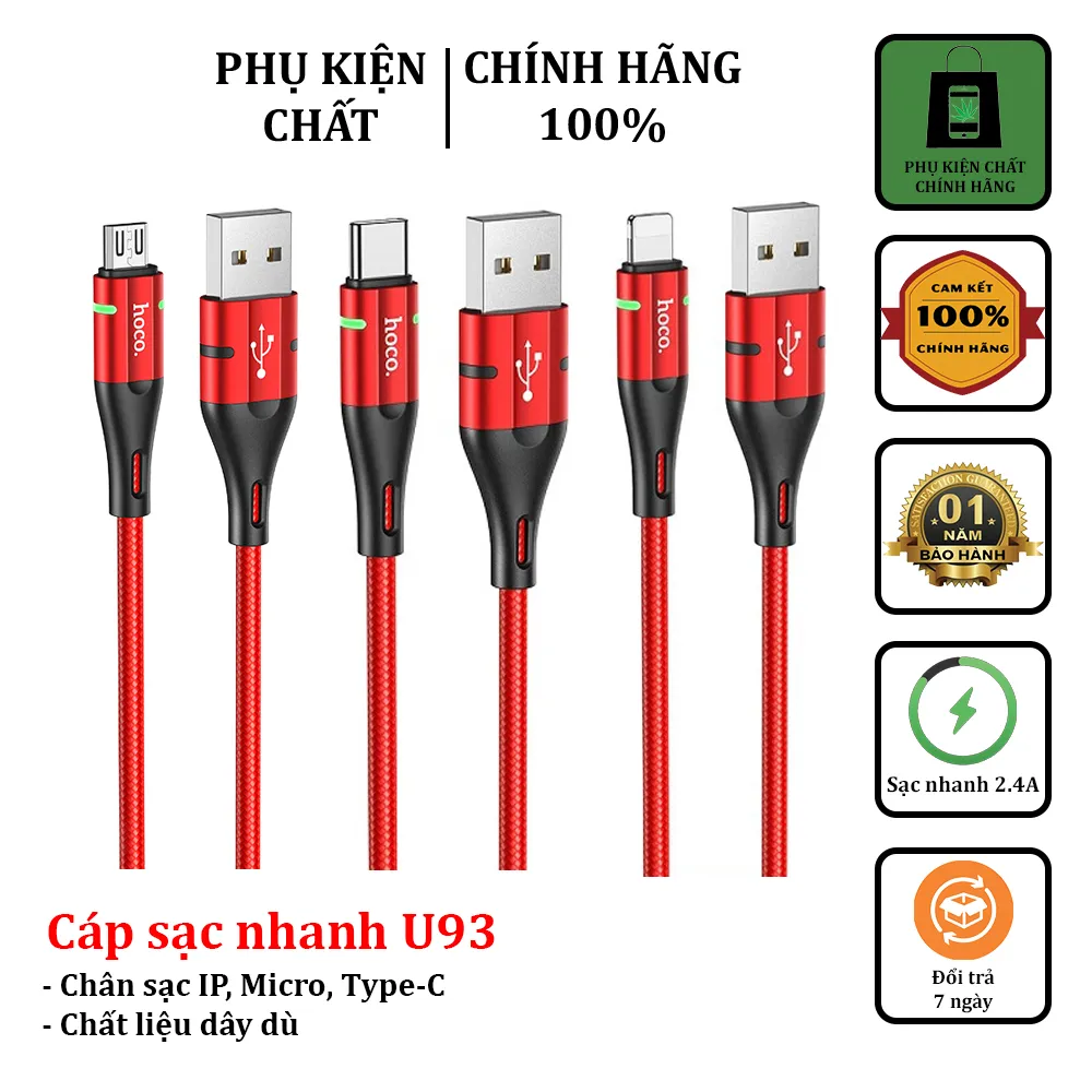 Đặc tính sản phẩm Cáp sạc nhanh Hoco U93 đầu IP, Micro, Type-C siêu bền 2.4A dây dài 1.2m bảo hành 12 tháng.