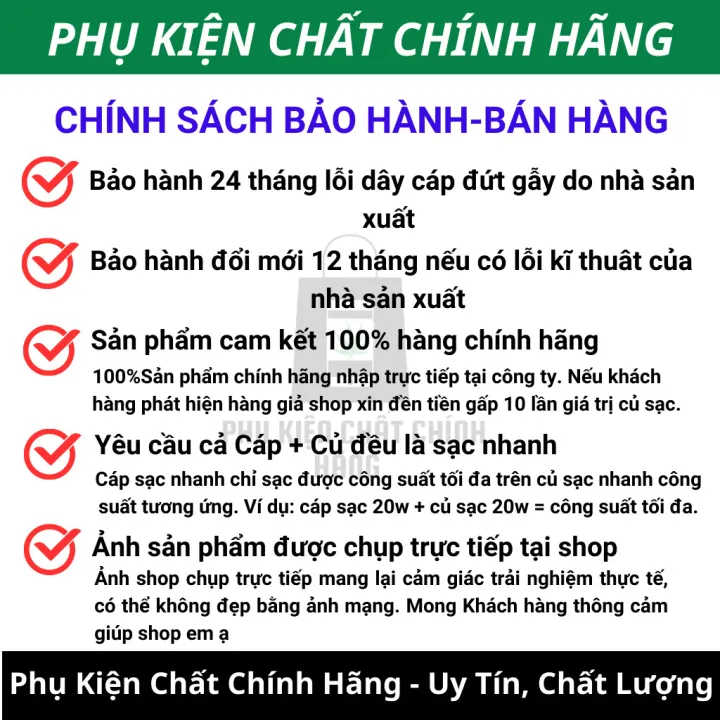 3. Chế độ bảo hành cho cáp sạc là 12 tháng tại cửa hàng nếu lỗi do nhà sản xuất, từ chối bảo hành các sản phẩm bị vào nước, rơi vỡ, va đập, do khách hàng làm hỏng...