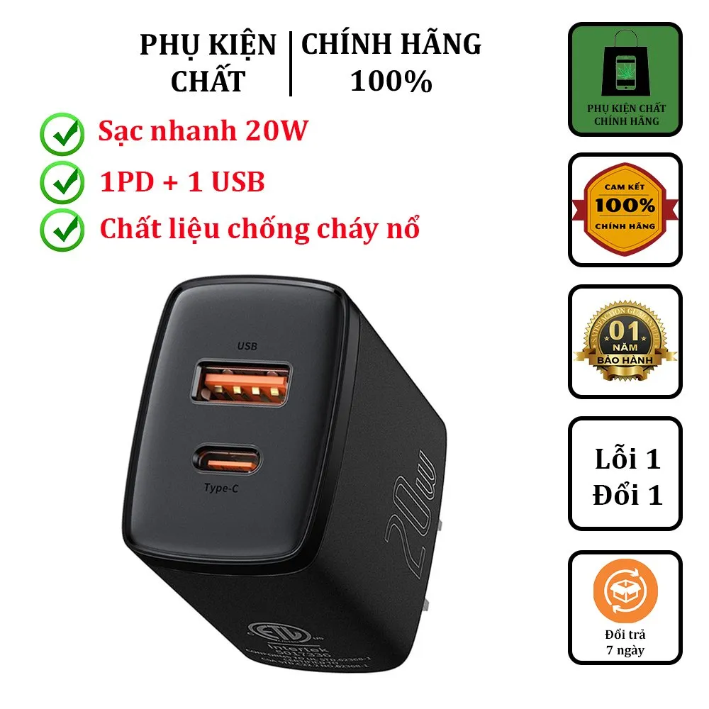 Đặc tính sản phẩm Củ sạc điện thoại Baseus Compact Quick Charger U+C 20W Sạc nhanh 30p, 2 cổng sạc, nhỏ gọn Bảo hành 18 tháng