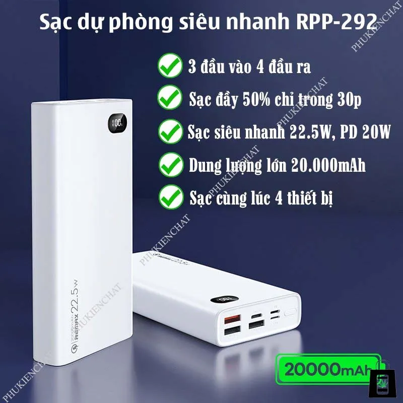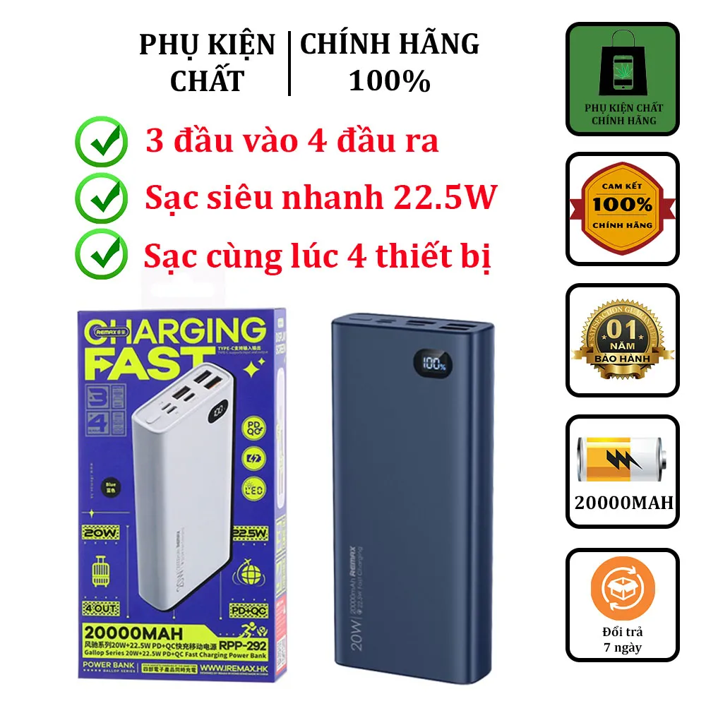 Đặc tính sản phẩm Pin dự phòng sạc nhanh Remax RPP-292 dung lượng 20000mAh QC 22.5W và PD 20W Bảo Hành 12 tháng.