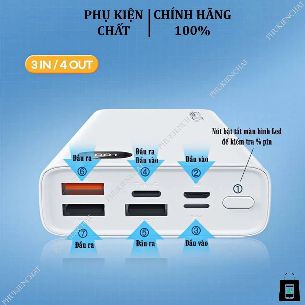 Như vậy, pin dự phòng có đến 4 cổng Output và 3 cổng Input hỗ trợ người dùng sạc cùng lúc 4 thiết bị vô cùng tiện lợi.