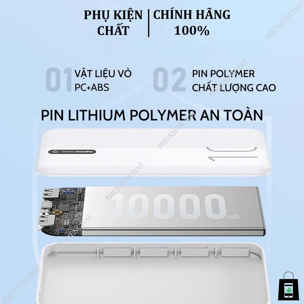 Pin sạc dự phòng 10000mAh Remax RPP-295 sử dụng lõi pin polymer siêu bền chất lượng cao, chống cháy nổ an toàn bên trong giúp tăng tuổi thọ cho sản phẩm, đảm bảo an toàn cho thiết bị và người dùng trong suốt quá trình sạc.