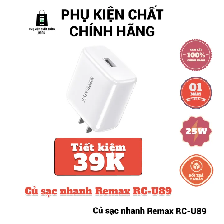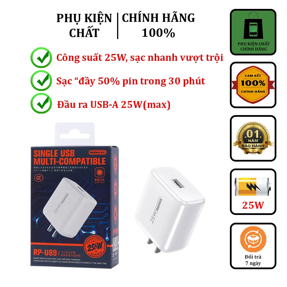 THÔNG TIN SẢN PHẨM: Củ sạc nhanh Remax RP-U89 cổng USB 25W hàng chuẩn hãng bảo hàng 12 tháng.
